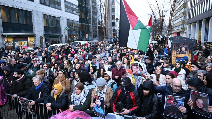 وتجمع المئات أمام المبنى الذي يجتمع فيه وزراء الخارجية، مطالبين الاتحاد الأوروبي بـ “عدم الاشتراك في جرائم الحرب التي ترتكبها إسرائيل”.