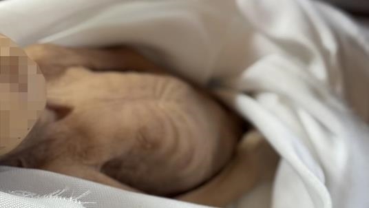 عدسة الأناضول، وثقت جثمان الطفلة داخل ثلاجة الموتى، وقد برزت أضلاعها النحيلة شاهدة على المجاعة التي تضرب القطاع.