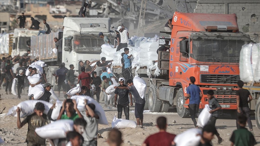 ورصدت عدسة الأناضول، اعتلاء عدد من الفلسطينيين الشاحنات المحملة بالمساعدات من أجل تأمينها من عمليات النهب، كما شكل بعضهم سلسلة بشرية في بعض المناطق التي مرت بها في إطار عملية التأمين.