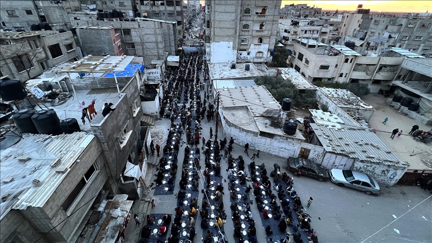 شاركها فيسبوك تويتر لينكدإن بينتيريست تيلقرام البريد الإلكتروني أُقيمت مأدبة الإفطار بأحد شوارع مدينة رفح وحضرها مئات الفلسطينيين بينهم أطفال ونساء في جو ممزوج بين الفرح والحزن جراء الحرب في قطاع غزة.. المصدر: وكالات