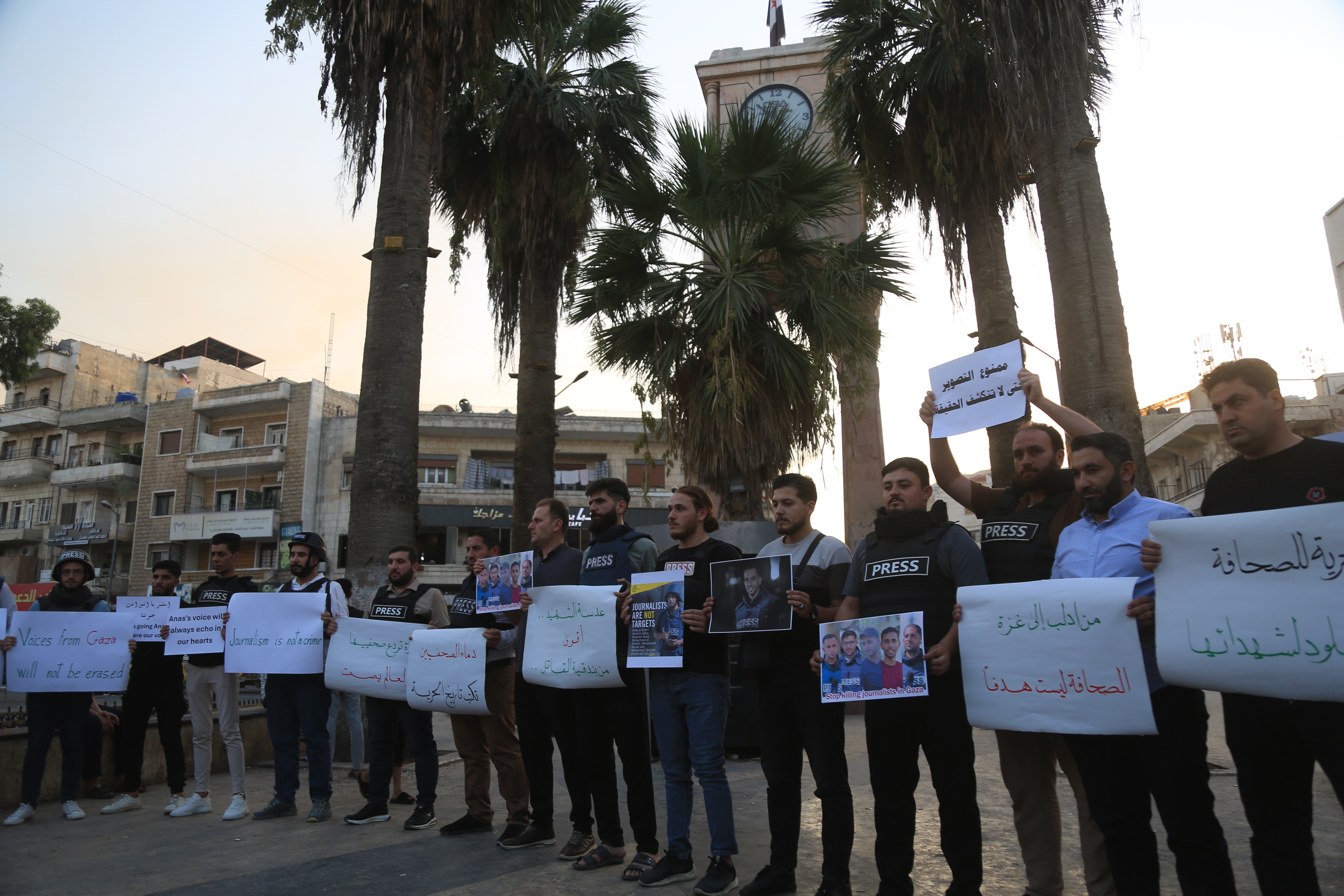أما في إدلب شمال غربي البلاد، فقد شارك صحفيون ونشطاء في مظاهرة مماثلة، عبّروا خلالها عن رفضهم لاستهداف الصحفيين الفلسطينيين.