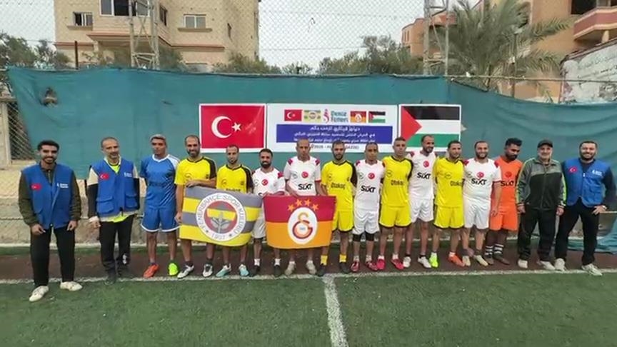 ونظمت جمعية “دينيز فيناري” التركية، الفعالية على ملعب خماسي نجا من تدمير واسع طال البنية الرياضية في القطاع، وارتدى خلالها اللاعبون قمصان الفريقين التركيين.