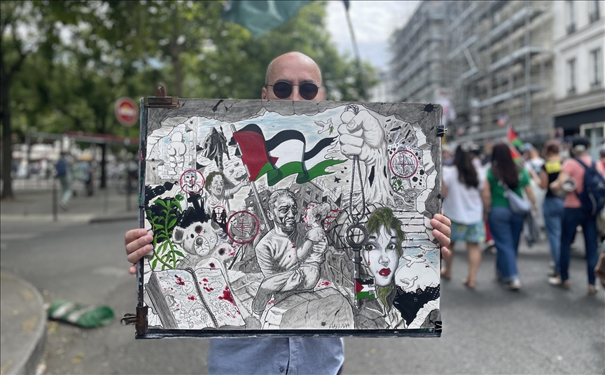 ولا يعد أبينا مجرد مشارك عابر في المظاهرات المناهضة للإبادة الجماعية في غزة والتي تنظم في باريس بين الحين والآخر، ففي كل مرة يشارك في إحدى المظاهرات، يحمل في يده اللوحتين، محاولا التذكير بالضحايا القطاع الفلسطيني.