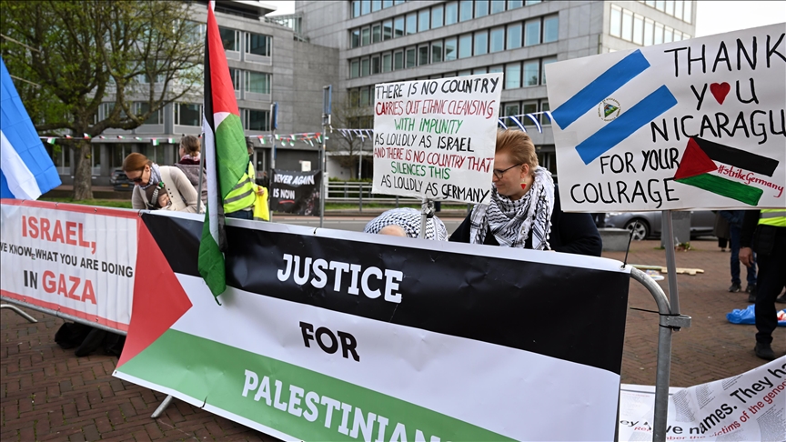 نظمت مجموعة من أنصار فلسطين، مظاهرة أمام مقر محكمة العدل الدولية في مدينة لاهاي الهولندية، على هامش جلسة الاستماع الأولى في دعوى رفعتها نيكاراغوا ضد ألمانيا بشأن “تسهيل الإبادة” في قطاع غزة.
