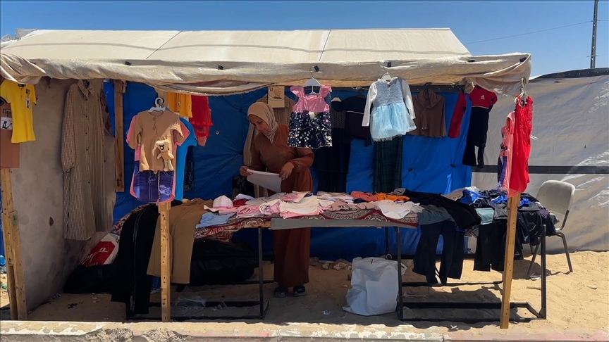 داخل خيمة صغيرة بمدينة خان يونس جنوبي قطاع غزة، تعرض الفلسطينية منار نصار ملابس نسائية وأخرى مخصصة للأطفال، للبيع في مشروع صغير افتتحته مؤخرا لإعالة أسرتها.