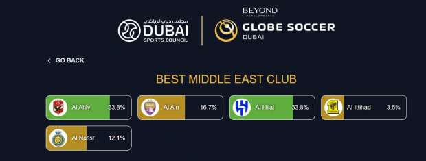 شهد آخر تحديث لتصويت النادي الأفضبل في الشرق الأوسط بين الأهلي والهلال والاتحاد والعين والنصر  ضمن جوائز جلوب سوكر الإماراتية صراع كبير بين الأهلي والهلال حيث شهد التحديث تعادل الأهلي والهلال في المنافسة الشرسة والقوية بين الطرفين.