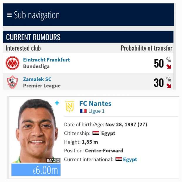 ووفقاً لموقع «فوت ميركاتو» فإن نادي آينتراخت فرانكفورت وجه أنظاره نحو مهاجم منتخب مصر ونادي نانت الفرنسي مصطفى محمد، الذي يعتبر من أبرز المواهب الهجومية في الوقت الحالي، وقد أثبت جدارته في الملاعب الأوروبية خلال المواسم الأخيرة.
