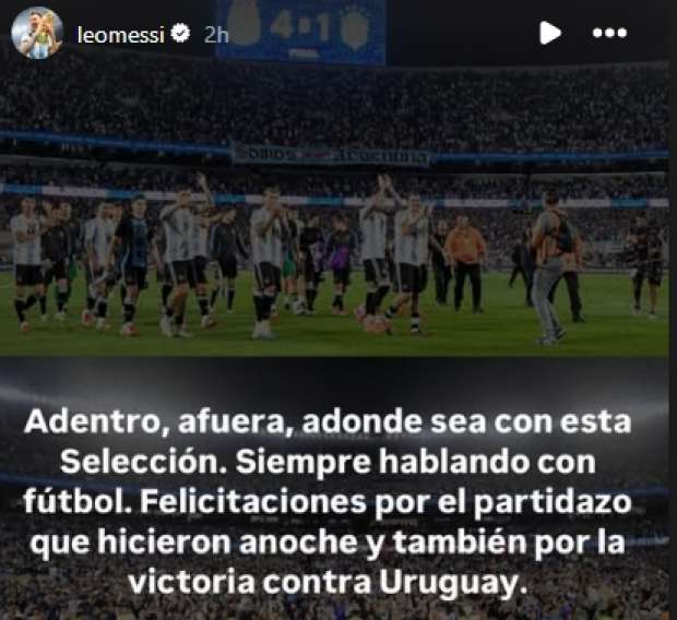 وعلق «ميسي» عبر حسابه الرسمي على موقع تبادل الصور الشهير «إنستجرام»: «داخل الملعب، خارجه، أينما كان، مع هذا المنتخب دائمًا، دائمًا نتحدث بكرة القدم. تهانينا على المباراة الرائعة التي لعبتموها الليلة الماضية وأيضًا على الفوز ضد أوروجواي».