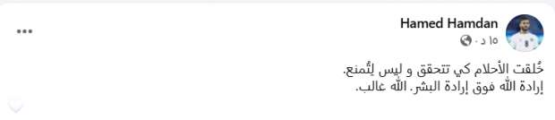 وكتب والد حامد حمدان تعليقًا على منشور نجله على حسابه الشخصي على موقع التواصل الاجتماعي «فيسبوك» والذي أكد لاعب بتروجت خلاله أن الأحلام خُلقت لتتحقق وليس لتمنع وأن إرادة الله فوق إرادة البشر في إشارة لمنعه من الانضمام للزمالك.