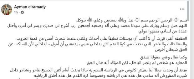 وكتب أيمن الرمادي، عبر حسابه الشخصي على موقع التواصل الاجتماعي «فيس بوك»: «بسم الله الرحمن الرحيم بسم الله نبدأ وبالله نستعين وعلي الله نتوكل اللهم صل وسلم وبارك علي سيدنا محمد وعلي أله وصحبه أجمعين رب أشرح لي صدري ويسر لي أمري وأحلل عقدة من لساني يفقهوا قولي الحقيقة أنني قررت ألا أكتب أي بوستات تعليقا علي أحداث ولكني عندما شعرت أمس من كمية الحروب والمغالطات والتناحر التي تحدث في كرة القدم كان بداخلي شيء يدفعني أن أقول مابداخلي لأن الساكت عن الحق شيطان أخرس وكما يقال وهي مقولة صدق المحايد هو شخص لم ينصر الباطل، لكن المؤكد أنه خذل الحق، فبعد أن وجدت فعلاً أننا نعيش كابوس في الرياضة المصرية ماذا يحدث أمام أعين الجميع تناحر وتشاجر داخل شيء المفروض أنه سامي هل هذه هي الرياضة وخصوصآ كرة القدم هل هذه أخلاق الرياضة».