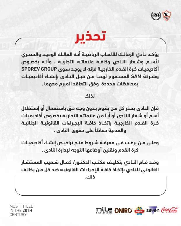 وتابع: «فإن النادي يحذر كل من يقوم باستعمال اسم أو شعار النادي أو أيا من علاماته التجارية بدون وجه حق بخصوص أكاديميات كرة القدم الخارجية، باتخاذ كافة الإجراءات القانونية الجنائية والمدنية حفاظا على حقوق النادي».
