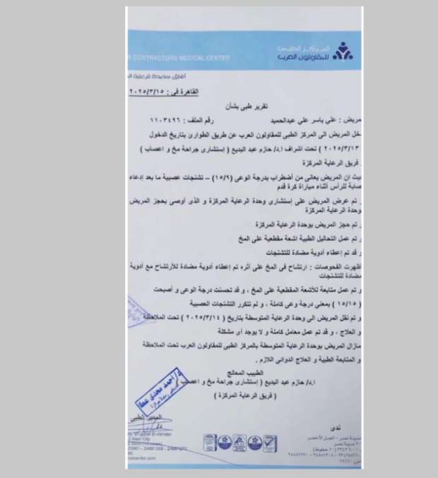 – تشنجات عصبية بعد إصابة بالرأس في أثناء مباراة بترول أسيوط.