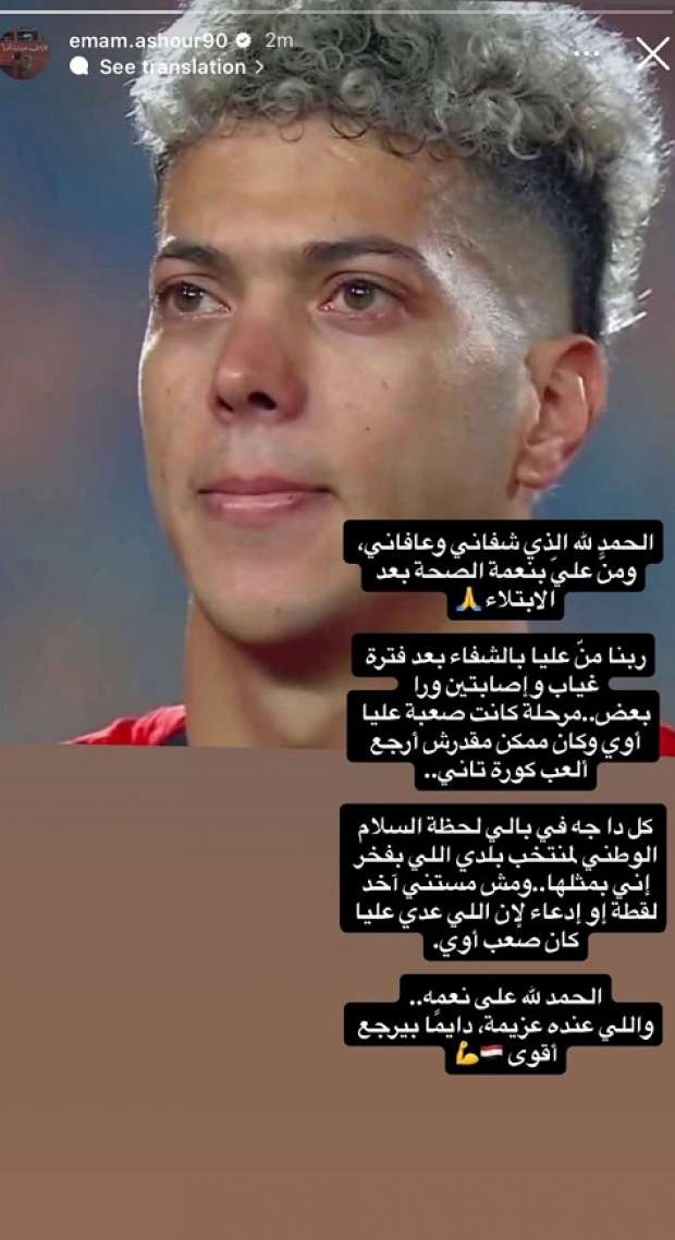 كتب إمام عاشور، عبر حسابه على «إنستجرام»: «الحمد لله الذي شفاني وعافاني، ومنّ عليّ بنعمة الصحة بعد الابتلاء».
