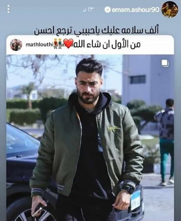 ونشر إمام عاشور، عبر «ستوري» منصة «إنستجرام» صورة لحمزة المثلوثي، وكتب عليها: «ألف سلامة عليك يا حبيبي إن شاء الله ترجع أحسن من الأول».