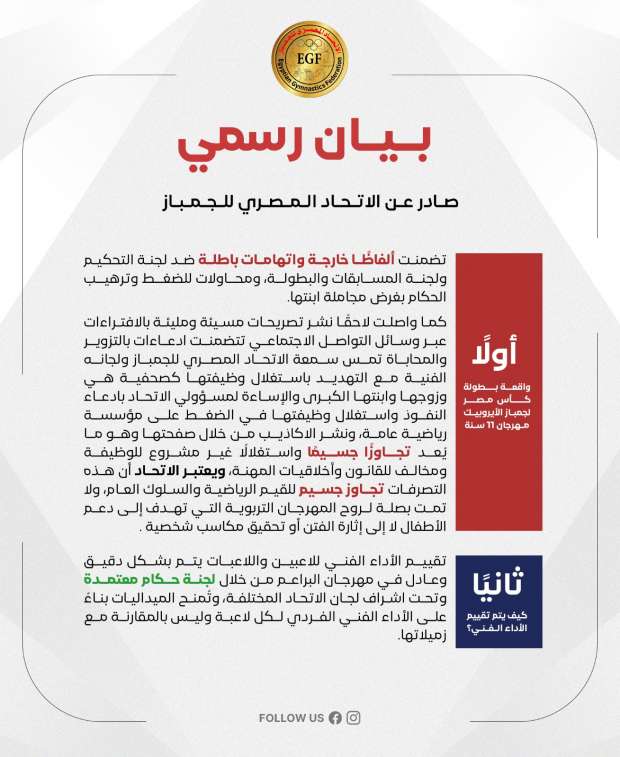 أصدر الاتحاد المصري للجمباز برئاسة الدكتور إيهاب أمين رئيس الاتحادين المصري والأفريقي وعضو المكتب التنفيذي للاتحاد الدولي، بيانا هاما بشأن ما حدث من تجاوزات خلال منافسات بطولة كأس مصر لجمباز الأيروبيك بصالة اتحاد الشرطة الرياضي.
