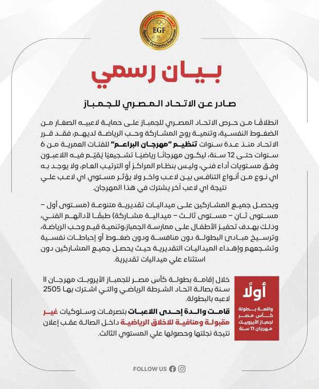 واخيرًا يؤكد الاتحاد المصري للجمباز على أنه يعمل في إطار الشفافية الكاملة، والنزاهة الفنية، واحترام القيم وأنه سيواصل جهوده في تربية أجيال من الرياضيين الصغار على قيم الاحترام، والمسؤولية، والروح الرياضية.