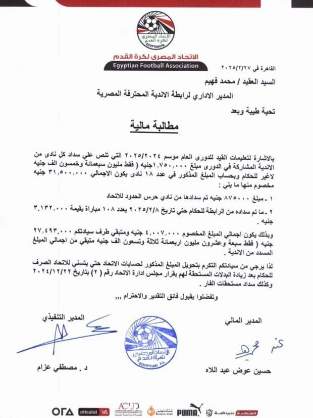 وأوضح خطاب اتحاد الكرة أنه وصل إلى خزينة الجبلاية 4 مليون و7 آلاف جنيه تتمثل في مبلغ 875000 جنيه تم سدادها من نادي حرس الحدود والاتحاد بجانب سداد رابطة الأندية 3 مليون و132 ألف جنيه ليتبقى 27 مليون و493 ألف جنيه، المبلغ المسدد من الأندية.