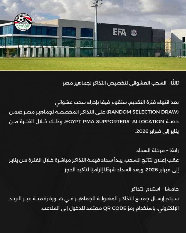 وبعد غلق باب التقديم، تدخل الطلبات مرحلة السحب العشوائي، حيث يقوم فيفا بتوزيع التذاكر المخصصة للجماهير المصرية من خلال قرعة إلكترونية تُجرى ما بين يناير وفبراير 2026.