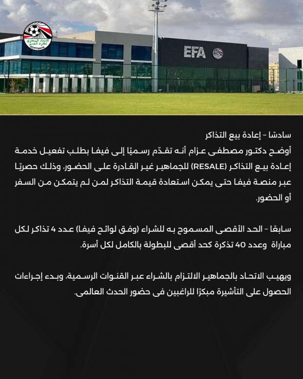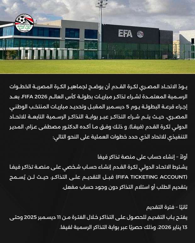 كشف مصطفى عزام، المدير التنفيذي للاتحاد المصري لكرة القدم، عن الخطوات الرسمية التي يجب أن يتبعها الجمهور الراغب في حضور مباريات كأس العالم 2026، مؤكدًا أن جميع إجراءات الحجز ستكون حصريًا عبر المنصة الإلكترونية التابعة للاتحاد الدولي «فيفا».