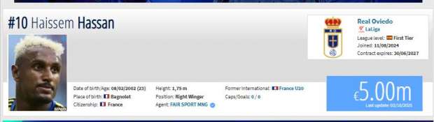 أصدر موقع «ترانسفير ماركت» العالمي، المتخصص في تقييم أسعار اللاعبين، تحديثًا جديدًا للقيم السوقية للاعبي الدوري الإسباني، الذي ينشط فيه المصري هيثم حسن، ضمن صفوف فريق ريال أوفييدو.