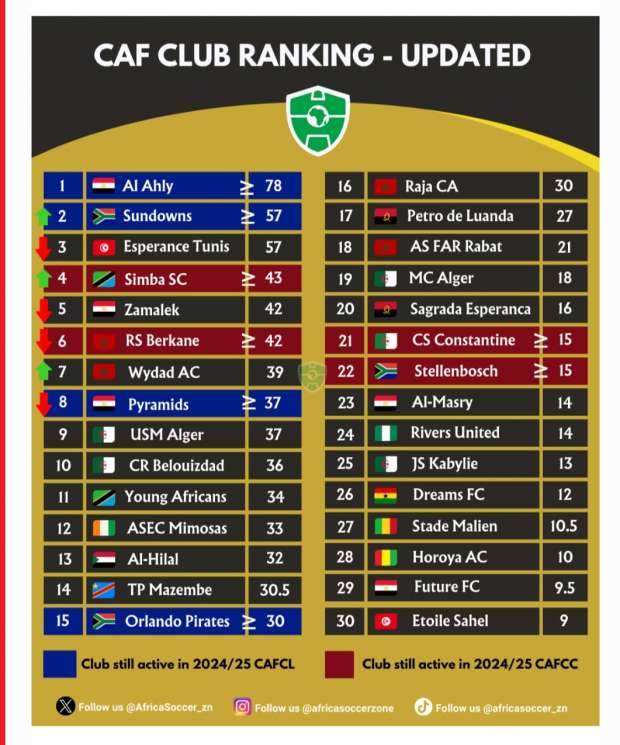 في تطور لافت، تقدم نادي سيمبا التنزاني إلى المركز الرابع، بعدما رفع رصيده إلى 43 نقطة، عقب تجاوزه المصري البورسعيدي، وبلوغه نصف نهائي كأس الكونفدرالية، أما نادي الزمالك فقد تراجع إلى المركز الخامس بـ42 نقطة بعد خروجه من ربع نهائي البطولة نفسها، إثر خسارته أمام ستيلينبوش الجنوب إفريقي بهدف نظيف.