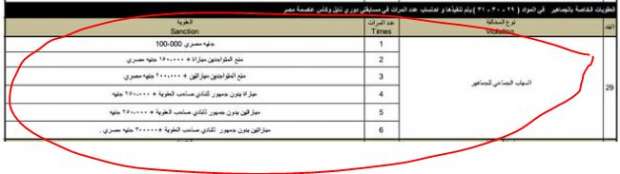 المادة 29 من لائحة العقوبات الخاصة برابطة الأندية، تنص على: «السباب الجماعي للجماهير غرامة مالية قدرها 100 ألف جنيه، وتضاعف عقوبة الإیقاف والعقوبة المالیة في حالة التكرار».
