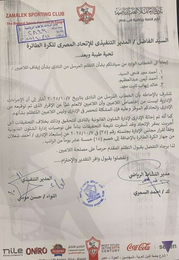 وتابع الخطاب: كما أنه تم إحالة الإداري لإدارة الشؤون القانونية بالنادي والتحقيق معه وجاءت نتيجة التحقيقات بإبعاد أحمد شعلان إداري فريق الطائرة من الفريق وخصم 15 يوما من راتبه.
