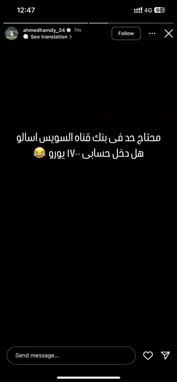 وأشعل اللاعب الأزمة، عبر حسابه الرسمي على «إنستجرام»، بنشره رسالة حادة كتب فيها: «حسبي الله ونعم الوكيل»، في تعبير واضح عن استيائه من الوضع، ولم يتوقف عند ذلك، بل نشر مجدداً قائلاً: «محتاج حد في بنك قناة السويس يسأل هل دخل حسابي 1600 يورو؟»، في إشارة إلى تأخر وصول مستحقاته المتعلقة بالعلاج.