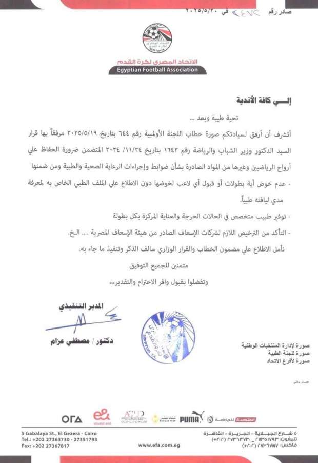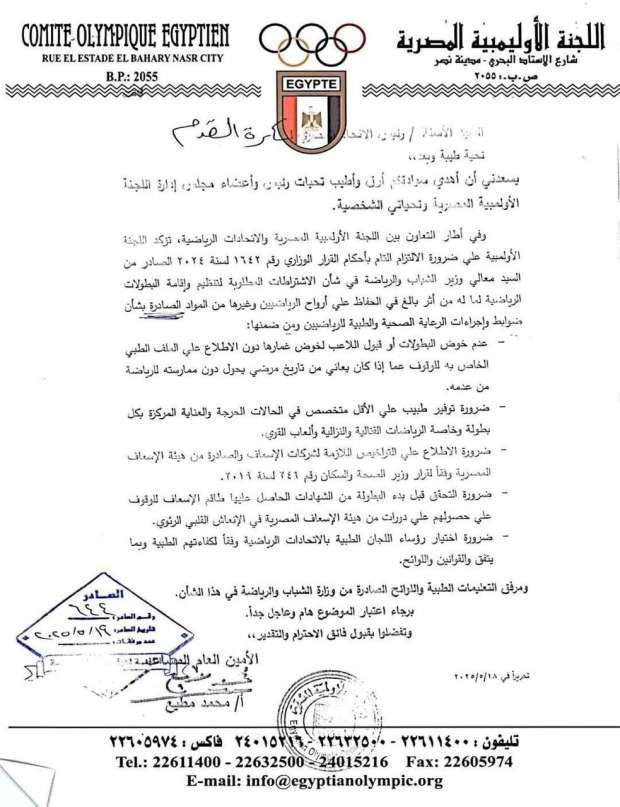 أتشرف أن أرفق لسيادتكم صورة خطاب اللجنة الأوليمبية رقم ٢٤٤ بتاريخ ٢٠٢٥/٥/١٩ مرفقًا بها قرار السيد الدكتور وزير الشباب والرياضة رقم ١٦٤٣ بتاريخ ٢٠٢٤/١١/٢٤ المتضمن ضرورة الحفاظ على أرواح الرياضيين وغيرها من المواد الصادرة بشأن ضوابط وإجراءات الرعاية الصحية والطبية ومن ضمنها: