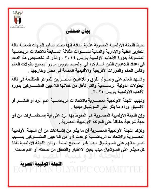 وقالت الرابطة في بيانها: «تحيط اللجنة الأولمبية المصرية عناية الكافة أنها بصدد تسليم الجهات المعنية كافة التقارير الفنية والإدارية والمالية للسنوات الثلاثة السابقة للاتحادات الرياضية المشاركة بدورة الألعاب الاولمبية باريس 2024، والذي تم تخصيص هذا الدعم في إعداد اللاعبين الذين شاركوا فى أولمبياد باريس مرورًا بجميع بطولات العالم وكأس العالم والدورات الأفريقية والإقليمية المقامة فى مصر وخارجها».