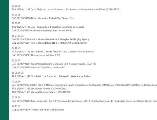 كشفت المحكمة الدولية الرياضية عن الجلسات الخاصة بالقضايا حتى يوم 4 من سبتمبر المقبل بعدما كانت أعلنت في وقت سابق عن الجلسات الخاصة بالقضايا حتى 21 أغسطس الماضي.