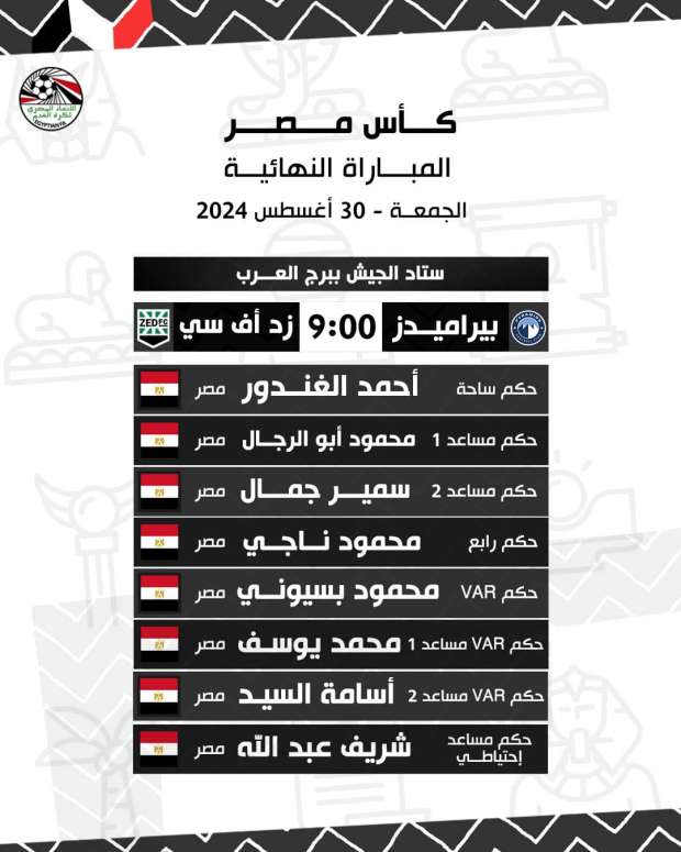 ومن المقرر أن يدير لقاء بيراميدز وزد إف سي، الحكم أحمد الغندور ويعاونه محمود أبو الرجال وسمير جمال ومحمود ناجي حكما رابعا، ومحمود بسيوني حكما لتقنية الفيديو ويعانه أسامة السيد، وحكم مساعد احتياطي شريف عبد الله.