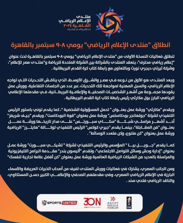 تنطلق فعاليات النسخة الأولى من منتدى الإعلام الرياضي يومي 8-9 سبتمبر تحت عنوان «منتدى رياضي محترف»، وينعقد المنتدى بالشراكة بين الشركة المتحدة للإعلام و«منتدى مصر للإعلام»، وشركة «ثيرتي ديجري نورث» وبالتعاون مع رابطة كتاب كرة القدم البريطانية.