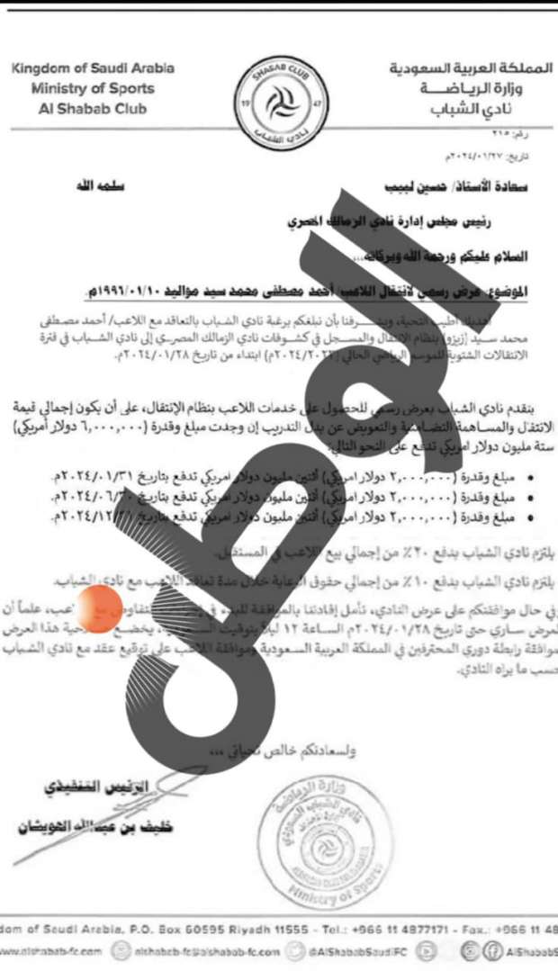 وينفرد «الوطن سبورت»، بنشر العرض الرسمي الذي قدم لنادي الزمالك من الشباب السعودي، لضم أحمد السيد زيزو، مقابل 6 ملايين دولار بخلاف باقي الإضافات الآخرى، إلى جانب تأشيرة الإمارات الخاصة باللاعب من أجل خضوعه للكشف الطبي تمهيدا لانضمامه إلى صفوف الفريق السعودي.
