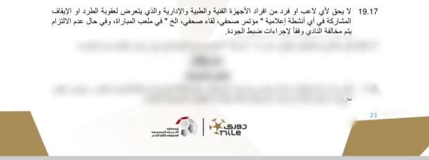 ومن المقرر أن تطبق رابطة الأندية عقوبة على نادي الزمالك لمخالفة المادة 17 البند 19 من اللائحة، بعد واقعة مدربه العام أيمن عبدالعزيز، الذي تم طرده وخرج بتصريحات تلفزيونية مع قناة ناديه الرسمية، وهو ما يعني مخالفة واضحة لنص المادة في هذا الشأن.
