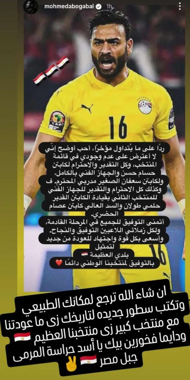 وأضاف: «وكذلك كل الاحترام والتقدير للجهاز الفني للمنتخب الثاني بقيادة الكابتن القدير حلمي طولان والسد العالي كابتن عصام الحضري، أتمنى التوفيق للجميع في المرحلة القادمة ولكل زملائي اللاعبين التوفيق والنجاح، وأسعى بكل قوة واجتهاد للعودة من جديد لتمثيل بلدي العظيمة بالتوفيق لمنتخبنا الوطني دائما».