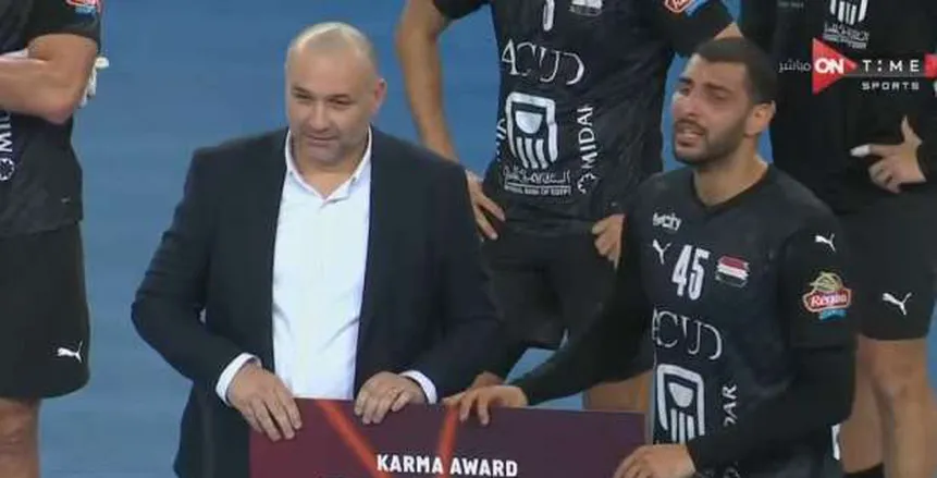 بكاء سيف الدرع لحظة استلام جائزة رجل مباراة مصر وفرنسا في مونديال اليد