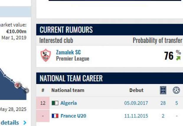 كشف موقع «ترانسفير ماركت»، المتخصص في الإحصائيات الرياضية، عن اقتراب نادي الزمالك من التعاقد مع اللاعب الجزائري آدم وناس، بنسبة تصل إلى 76%.
