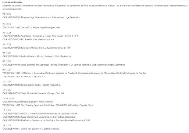 ونشرت المحكمة الرياضية الدولية بيانًا رسميًا يتضمن القضايا المرفوعة أمام ومواعيد جلسات الاستماع للنظر فيها وذلك حتى يوم 21 نوفمبر المقبل، والتي يبلغ عددها 17 قضية بداية من اليوم الجمعة 24 أكتوبر الجاري، وسط ترقب لمصير دعوى نادي بيراميدز لسحب لقب الدوري من الأهلي في الموسم الماضي.
