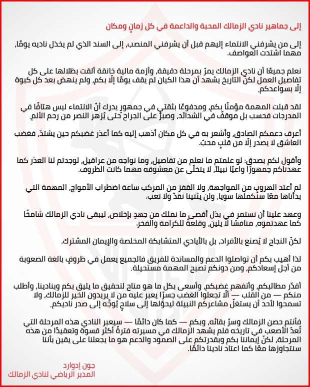 وقال جون إدوارد، في بيانه: «إلى من يشرفني الانتماء إليهم قبل أن يشرفني المنصب، إلى السند الذي لم يخذل ناديه يوما مهما اشتدت العواصف، إلى جماهير نادي الزمالك المحبة والداعمة في كل زمان ومكان، إلى من يشرفني الانتماء إليهم قبل أن يشرفني المنصب، إلى السند الذي لم يخذل ناديه يوما، مهما اشتدت العواصف، نعلم جميعا أن نادي الزمالك يمر بمرحلة دقيقة، وأزمة مالية خانقة ألقت بظلالها على كل تفاصيل العمل، لكنّ التاريخ يشهد أن هذا الكيان لم يقف يوما إلا بكم، ولم ينهض بعد كل كبوة إلا بسواعدكم».