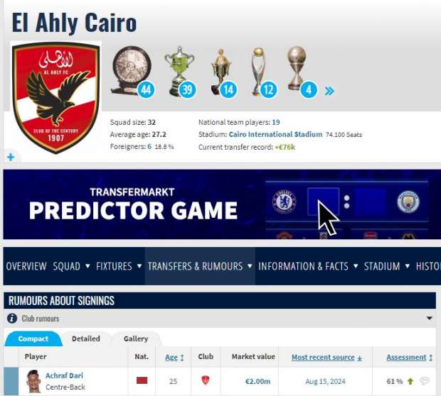 «ترانسفير ماركت» يكشف نسبة انتقال أشرف داري للأهلي