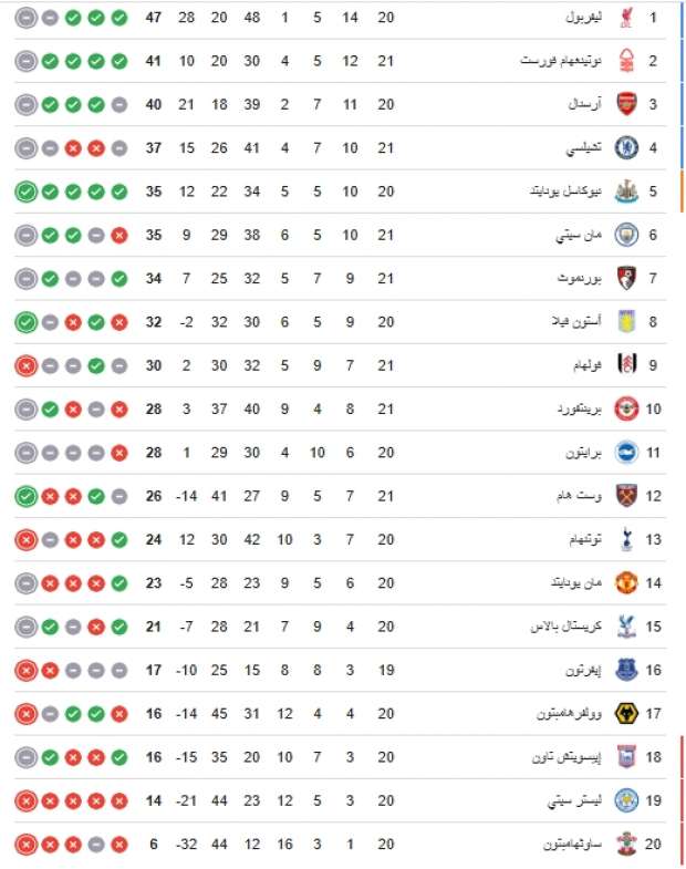 وفي آخر 5 مراكز يتواجد كريستال بالاس برصيد 21 نقطة وإيفرتون برصيد 17 نقطة وولفرهامبتون برصيد 16 نقطة وإيبسويتش تاون برصيد 16 نقطة وليستر سيتي برصيد 14 نقطة وساثهامبتون برصيد 6 نقاط.