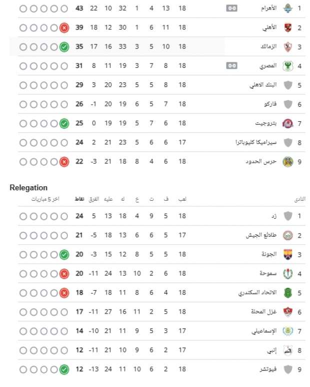 ترتيب الأندية المتنافسة على البقاء والهبوط في الدوري المصري
