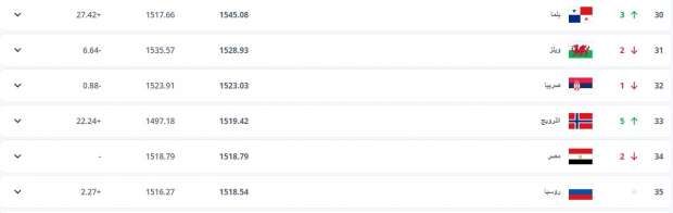 ويحتل منتخب مصر في الوقت الحالي المركز 34 في تصنيف «فيفا» الأخير برصيد 1518.79 نقطة قبل خوضه مباراتي إثيوبيا وبوركينا فاسو، ويسعى حسام حسن خلال معسكر سبتمبر الجاري للفوز على منافسيه من أجل التقدم مجددا في التصنيف العالمي للمنتخبات.