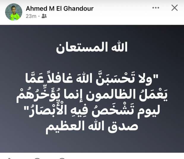واستعان أحمد الغندور بآيه قرانية عبر صفحته على منصة «فيس بوك»؛ إذ كتب قائلا: «الله المستعان.. (وَلَا تَحْسَبَنَّ اللَّهَ غَافِلًا عَمَّا يَعْمَلُ الظَّالِمُونَ ۚ إِنَّمَا يُؤَخِّرُهُمْ لِيَوْمٍ تَشْخَصُ فِيهِ الْأَبْصَارُ).. صدق الله العظيم».