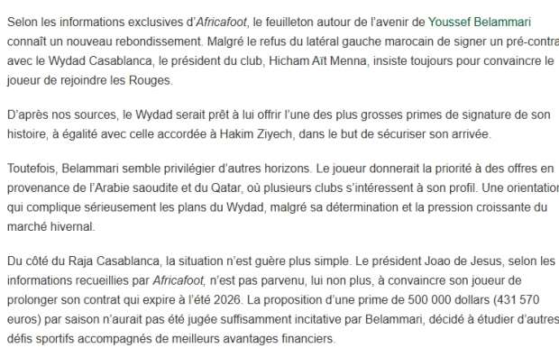 أشار الموقع إلى أن الوضع في الرجاء، لم يكن أكثر استقرارًا، فقد فشل رئيس النادي جواو دي جيسوس، في إقناع بلعماري، بتمديد عقده الذي ينتهي في صيف 2026، رغم عرض مكافأة سنوية بلغت 500 ألف دولار، وهي قيمة لم تعتبرها إدارة اللاعب كافية بالنظر إلى العروض الخليجية والأوروبية التي تلقاها مؤخرًا.