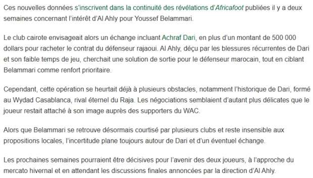 وكشف الموقع الفرنسي عن اهتمام النادي الأهلي بالتعاقد مع بلعماري، وأفاد أن الأحمر يدرس صفقة تبادل تشمل المدافع المغربي أشرف داري، إلى جانب دفع 500 ألف دولار، مقابل فسخ عقد بلعماري مع الرجاء.