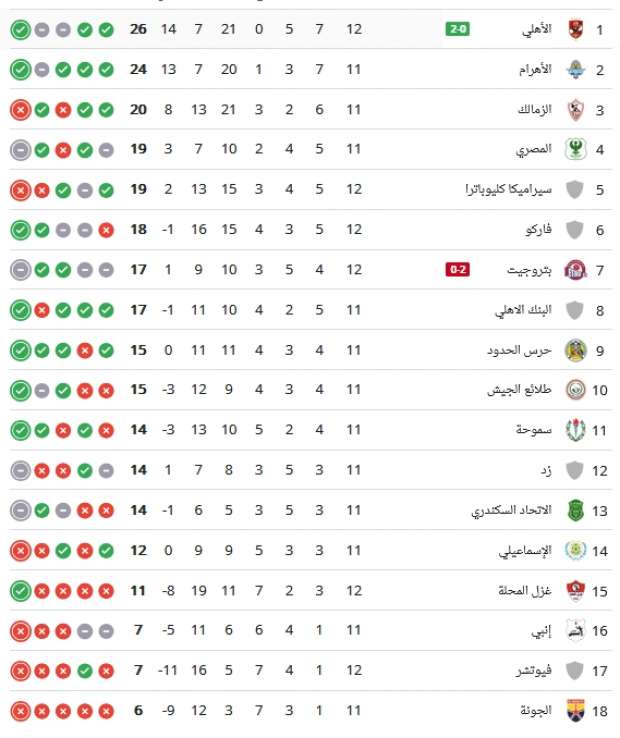 ويتصدر الأهلي جدول ترتيب الدوري برصيد 26 نقطة بفارق نقطتين عن بيراميدز صاحب المركز الثاني والذي يتبقى له مباراة بالجولة الـ12، فيما يأتي الزمالك في المركز الثالث برصيد 20 نقطة بعد خسارته في المباراة الماضية أمام بيراميدز ليتراجع في الترتيب وتنتظره مباراة قوية غدًا أمام الإسماعيلي على استاد القاهرة الدولي.