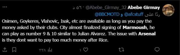 وقال أحد المعلقين: «أوسيمين، فلاهوفيتش، إيزاك، إلخ، متاحون طالما أنك تدفع المبلغ الذي تطلبه أنديتهم، مانشستر سيتي أنهى التعاقد مع مرموش، يمكنه اللعب في مركزي 9 و10 على غرار ألفاريز، الأزمة أن النادي لا يرغب في دفع المال بعد صفقة ديكلان رايس».
