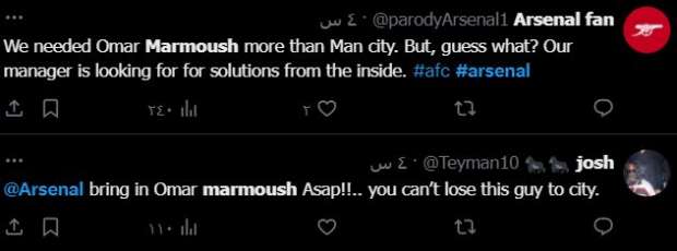 فيما طالب آخر ضرورة التعاقد مع مرموش؛ إذ وجه رسالة لناديه قائلا: «آرسنال، أحضروا عمر مرموش في أسرع وقت ممكن!!.. لا يمكنك أن تخسر هذا الرجل لصالح سيتي».